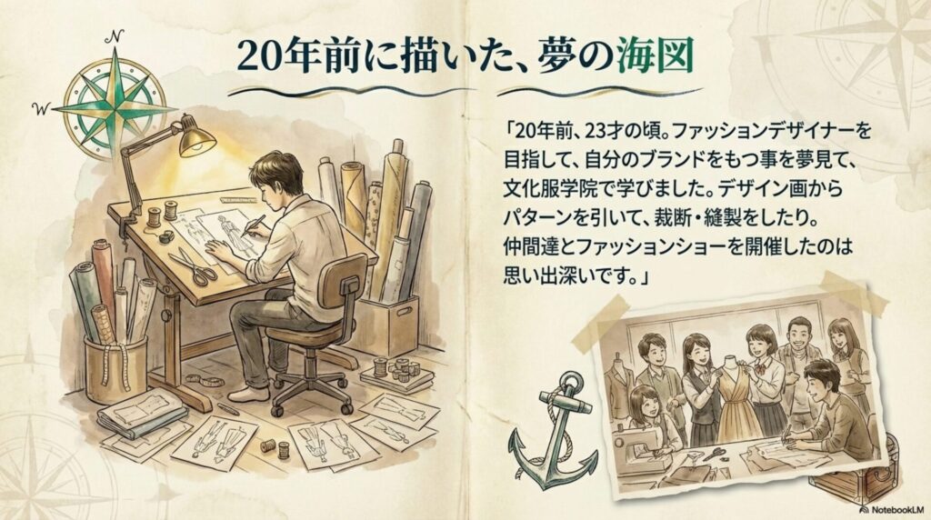 20年前、僕は23才の頃、ファッションデザイナーを目指して、自分のブランドをもつ事を夢見て、服飾の専門学校、文化服装学院で学びました。
